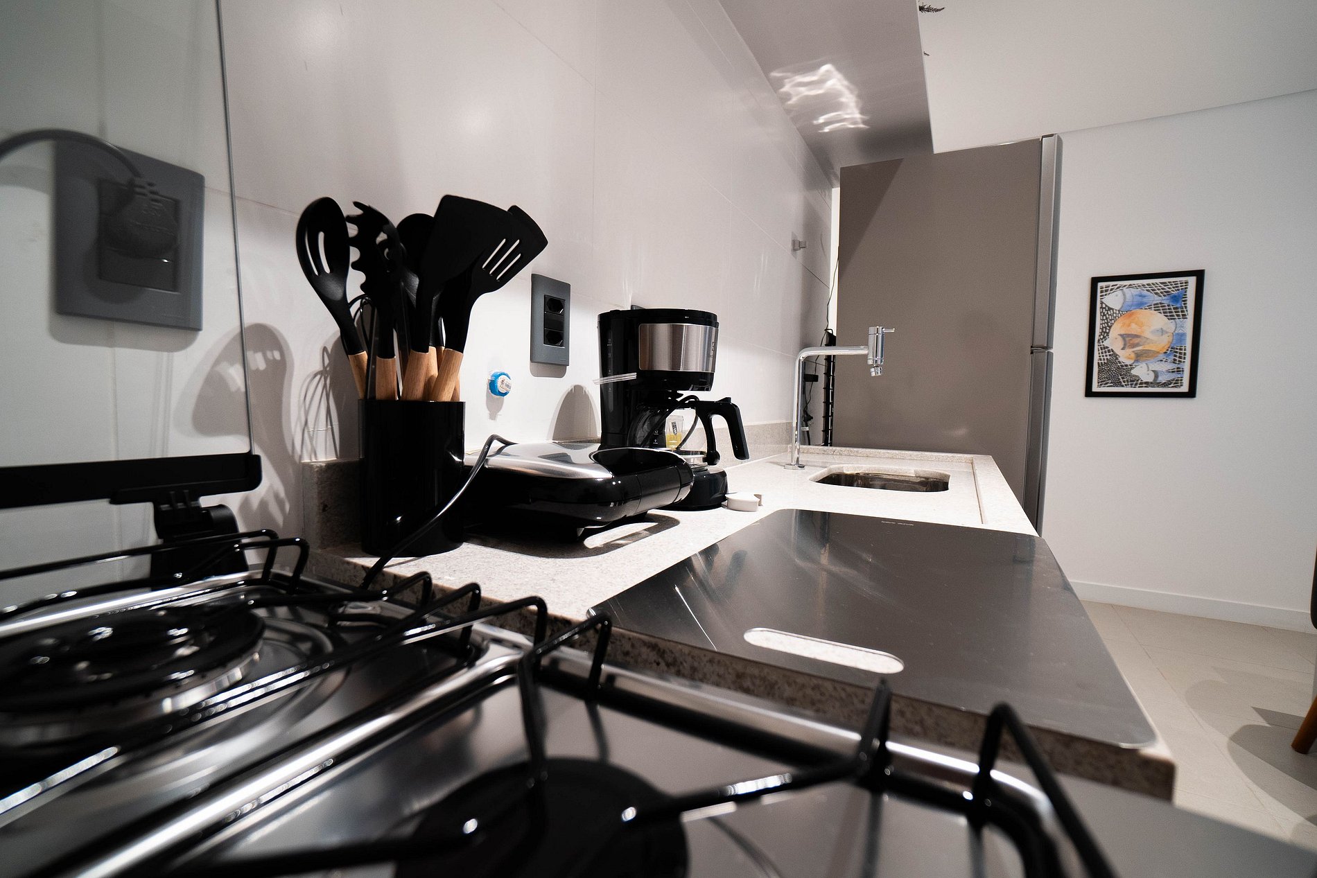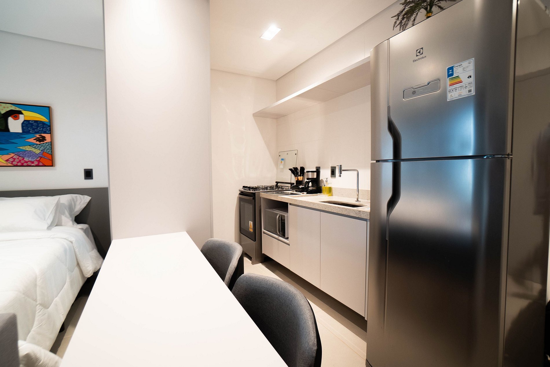O espaço conta com uma cama queen confortável, cozinha equipada com geladeira, cooktop, micro-ondas e cafeteira, além de uma bancada funcional que pode ser usada tanto para refeições rápidas quanto para home office.