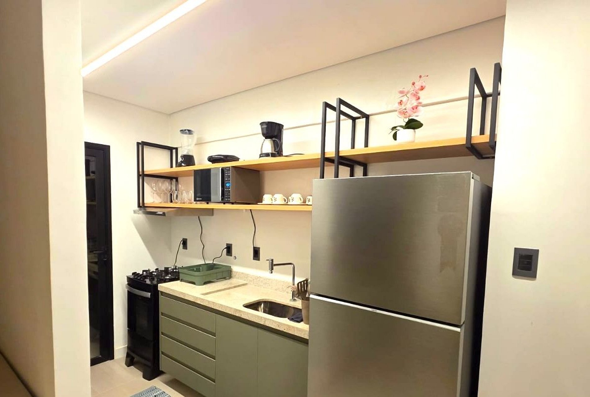 - Cozinha equipada (geladeira, micro-ondas, fogão, sanduicheira, liquidificador, pia em granito e utensílios básicos)