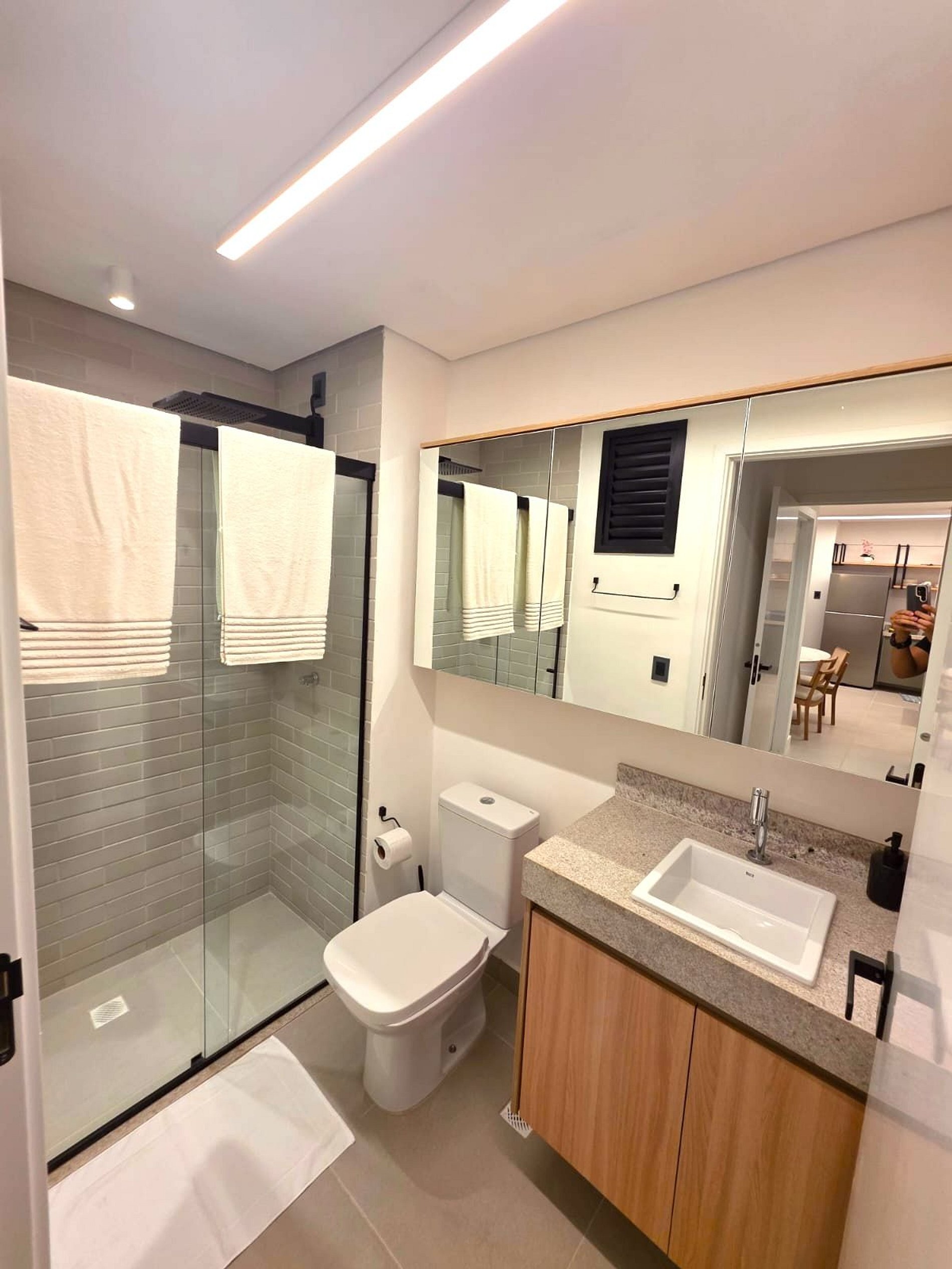 - 2 banheiros modernos com box de vidro e bancadas em granito