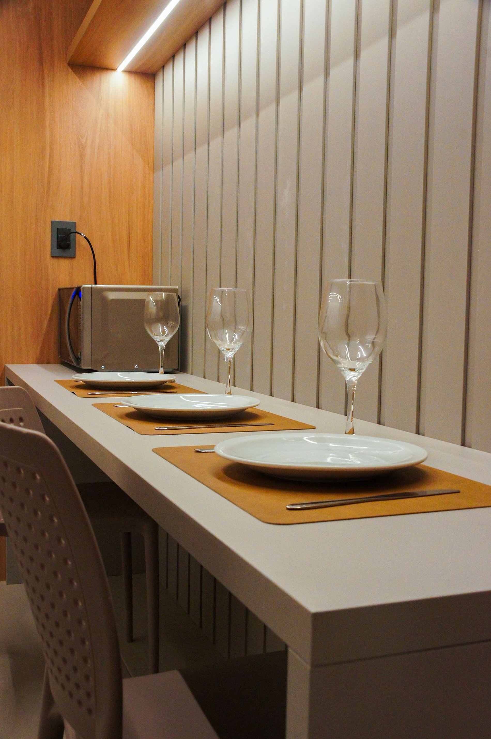 O espaço conta com uma cama queen confortável, cozinha equipada com geladeira, cooktop por indução, micro-ondas, cafeteira e liquidificador, além de duas bancadas funcionais: uma integrada à cozinha com três lugares e outra integrada à sala. Ambas podem ser utilizadas tanto para refeições quanto para home office.