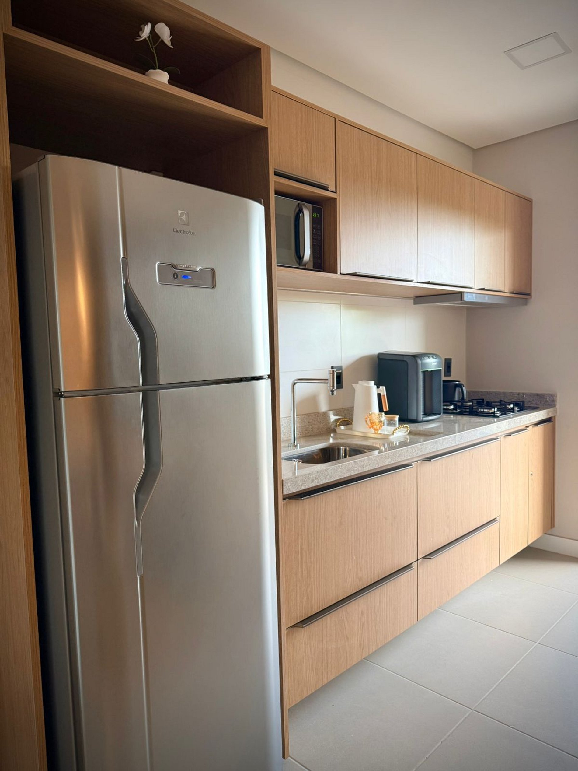 - Cozinha equipada (geladeira duplex, micro-ondas, fogão, bebedouro, pia em granito e utensílios básicos)