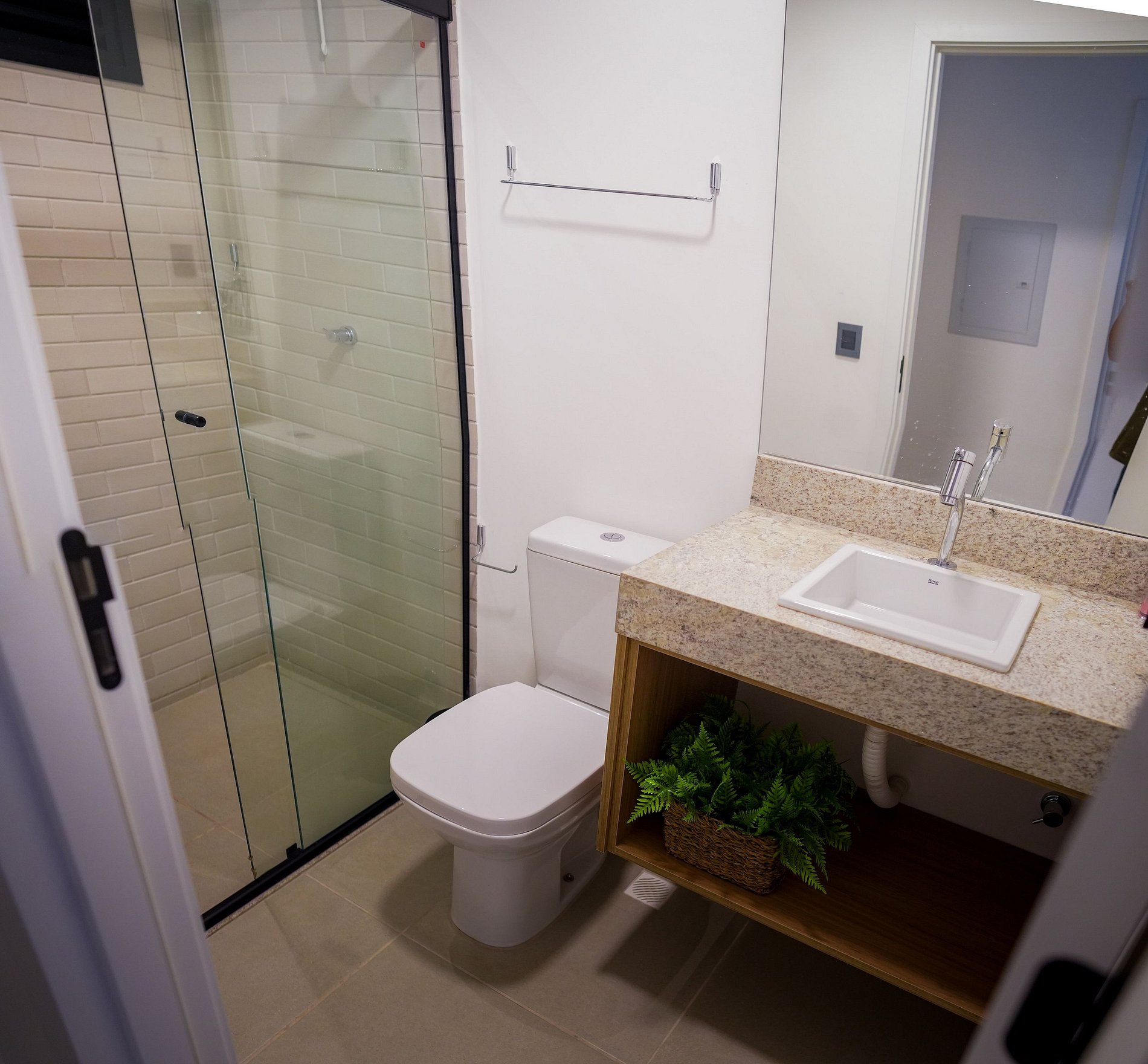 - 2 banheiros modernos com box de vidro e bancadas em granito