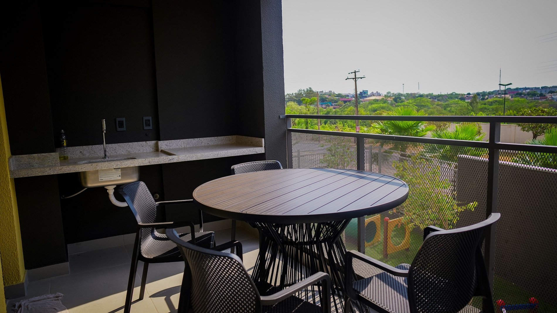 - Sacada mobiliada com mesa, cadeiras e vista para o condomínio
